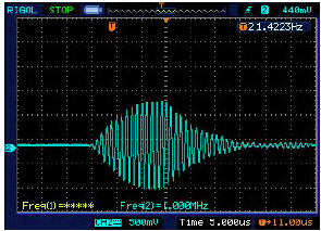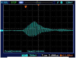 在超聲波流量測量時,首先要對換能器進行驅動,激勵換能器產生振蕩并發出超聲波信號,以下是分別采用1個驅動脈沖、10個驅動脈沖和15個驅動脈沖作為換能器的激勵源,圖2是1個驅動脈沖時,接收端換能器所接收到的波形。可以看出,當一個脈沖驅動時,所接收到的波形比較微弱,波形很不規范。圖3是10個驅動脈沖時,接收端換能器所接收到的波形。波形形狀得到明顯改善。圖4是15個驅動脈沖時,接收端換能器所接收到的波形。