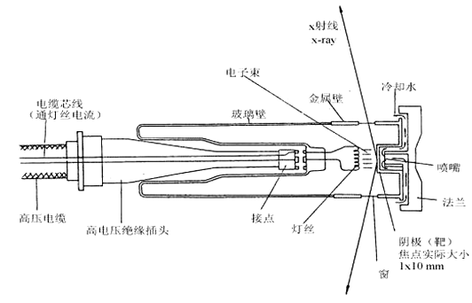 用來產生X射線的裝置是X射線管。它由陰極、陽極和真空玻璃(或金屬陶瓷)外殼組成,其簡單結構和工作原理如圖1所示。陰極通以電流加熱至白熾狀態(tài)時,其陽極周圍形成電子云,當在陽極與陰極間施加高壓時,電子加速穿過真空空間,高速運動的電子束集中轟擊陽極靶子的一個面積(幾平方毫米左右、稱實際焦點),電子被阻擋減速和吸收,其部分動能(約1%)轉換為X射線,其余99%以上的能量變成熱能。